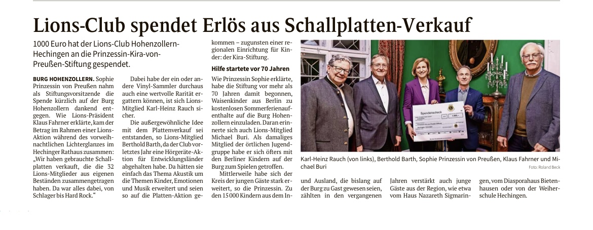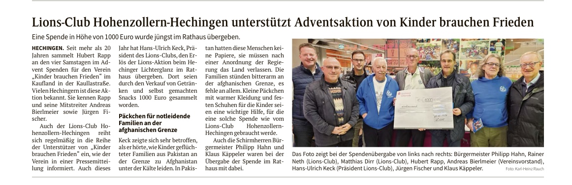 | 29.12.2020 | Lions Club Hohenzolleern - Hechingen spendet 2.500 Euro für Kinder brauchen Frieden | Zeitungsbericht | ||||||||||||||||||||||||