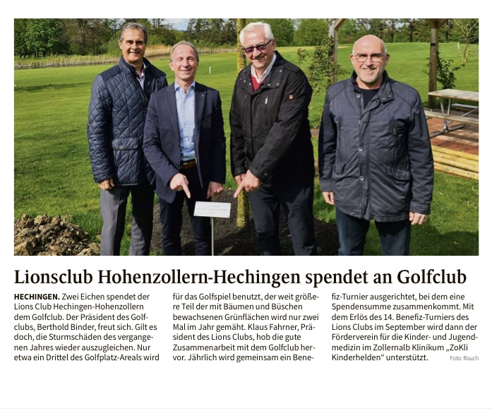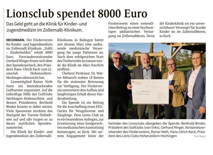 | 13.11.2019 | Lions Club Hohenzollern - Hechingen spendet den Erlös des 10-ten Benefiz-Golfturniers an die Nachsorgeklinik Tannheim | Zeitungsbericht | ||||||||||||||||||||||||